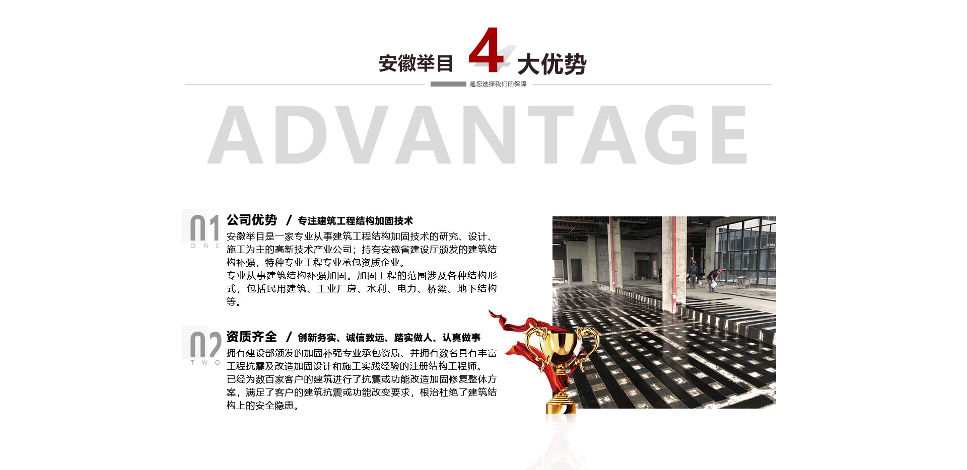 安徽舉目工程加固有限公司是一家專業從事建筑工程結構加固技術的研究、設計、施工為主的高新技術產業公司,成立于2012年。持有安徽省建設廳頒發的建筑結構補強,特種專業工程專業承包資質企業。專業從事建筑結構補強加固。加固工程的范圍涉及各種結構形式,包括民用建筑、工業廠房、水利、電力、橋梁、地下結構等。公司依托高校土木建筑學院、省建筑科學研究機構專業從事建筑結構加固、檢測、鑒定、設計、施工、公司擁有建設部頒發...